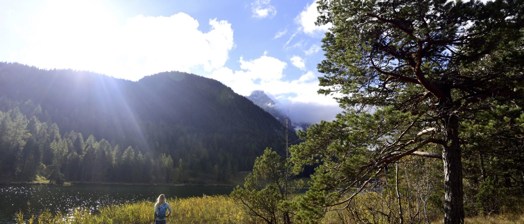 The starting point of the Terrainkurweg 1 through the Laintal valley around the Lautersee is the railway station in Mittenwald. This is easily reached by train and various buses. From there, you walk past the pedestrian zone and the striking church tower into the Laintalstraße of the historic district of Gries. At the end of the street, the Laintal begins with a slight ascent. The ascending hiking trail leads upwards to the right of the Laintal