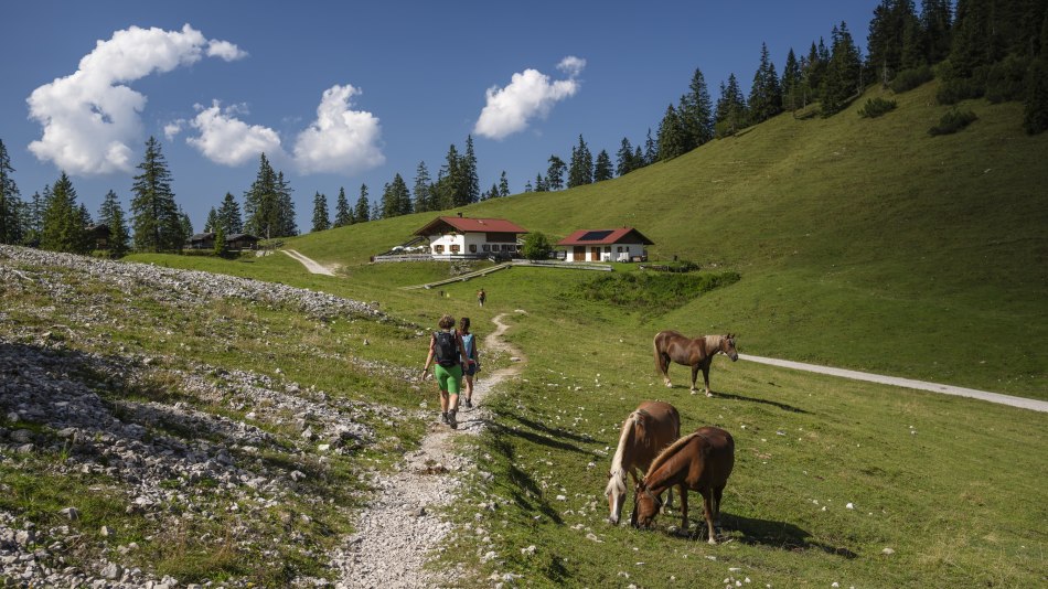 Martl nimmt mich mit zur Viehweide unten an der Isar . Auf seine Rufe hin kommen die Rinder hinter den vielen Weidenbüschen hervor, gierig stecken sie ihre Schnauzen in den Futtereimer. „Das sind Murnau-Werdenfelser“, sagt Martl und deutet auf einige kleinere, braun-schwarze Kühe. Später treffen wir auch die Rösser. Wegen ihrer Weide trägt die Auhütte seit etwa 1540 übrigens auch den Namen „Rosshüttle“. Gleich hinter der Hütte hält Martl zwei Schweine, Resi und Rosi. Er ist nicht nur erfahrener Gemeindehirte, sondern auch leidenschaftlicher Jäger. Die Herren von Luxemburg oder sein eigener Bruder nehmen ihn gerne mit auf die Jagd ins Karwendel ; Das Wild kauft er Ihnen dann direkt ab. Der gebürtige Mittenwalder kann auch Wild präparieren, hält Hütten und Weiden in Schuss, spielt Gitarre, singt und kocht. Dass er obendrein das Metzgerhandwerk gelernt hat, ist ein Glück – vor allem für die Gäste. So gibt es auf Auhütte und Fischbachalm hausgeräucherten Speck, würziges Carpaccio vom Hirschschinken und Wildbratwürstel, Rucksacksalami oder Gamsknacker. Dazu kommen feiner Bergkäse, den Beates Schwester von ihrem Bauernhof liefert, und Liköre, etwa von Zwetschgen oder Bratapfel. All diese Spezialitäten kann man auch mitnehmen, und Beate arrangiert sie auf Wunsch liebevoll zu einem „Schmankerlkorb“.