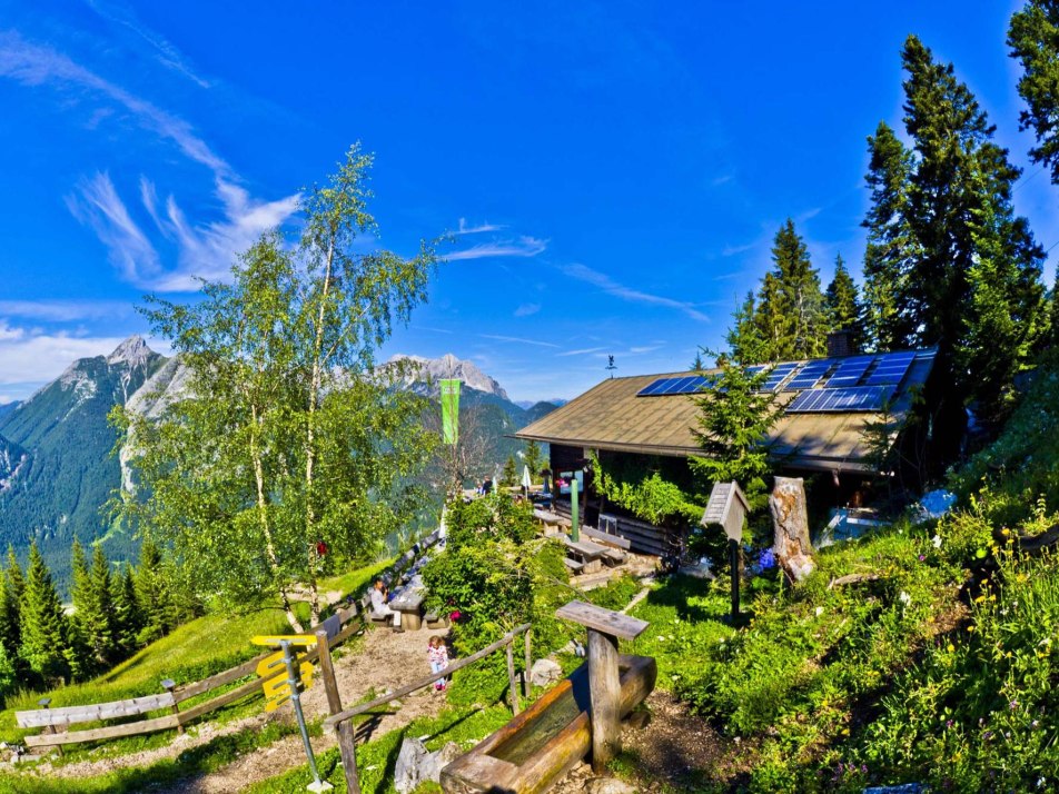 Brunnsteinhütte is located at 1,560 metres and offers unique views of the Upper Isar Valley as well as the surrounding mountain ranges. The Alpine Club hut near Mittenwald is popular both as an excursion destination and as a stopover for multi-day tours. Brunnsteinhütte is characterised above all by sustainable and environmentally friendly operation as well as the use of regional products of the highest quality. The cosy hut is particularly appreciated by families with children, thanks to numerous animals and a playground next to the large terrace.