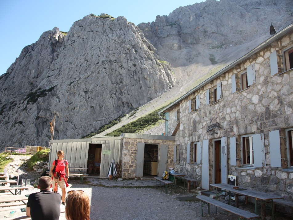 Both the road and the Ochsenboden-Steig lead to the "Bankerl" (bench), where the serpentine path begins, leading to the hut in about 45 minutes. Hikers can also descend from the Karwendel railway mountain station through Dammkar to the hut. From the neighbouring Hochlandhütte, a mountain path also leads up to the so-called "Bankerl".