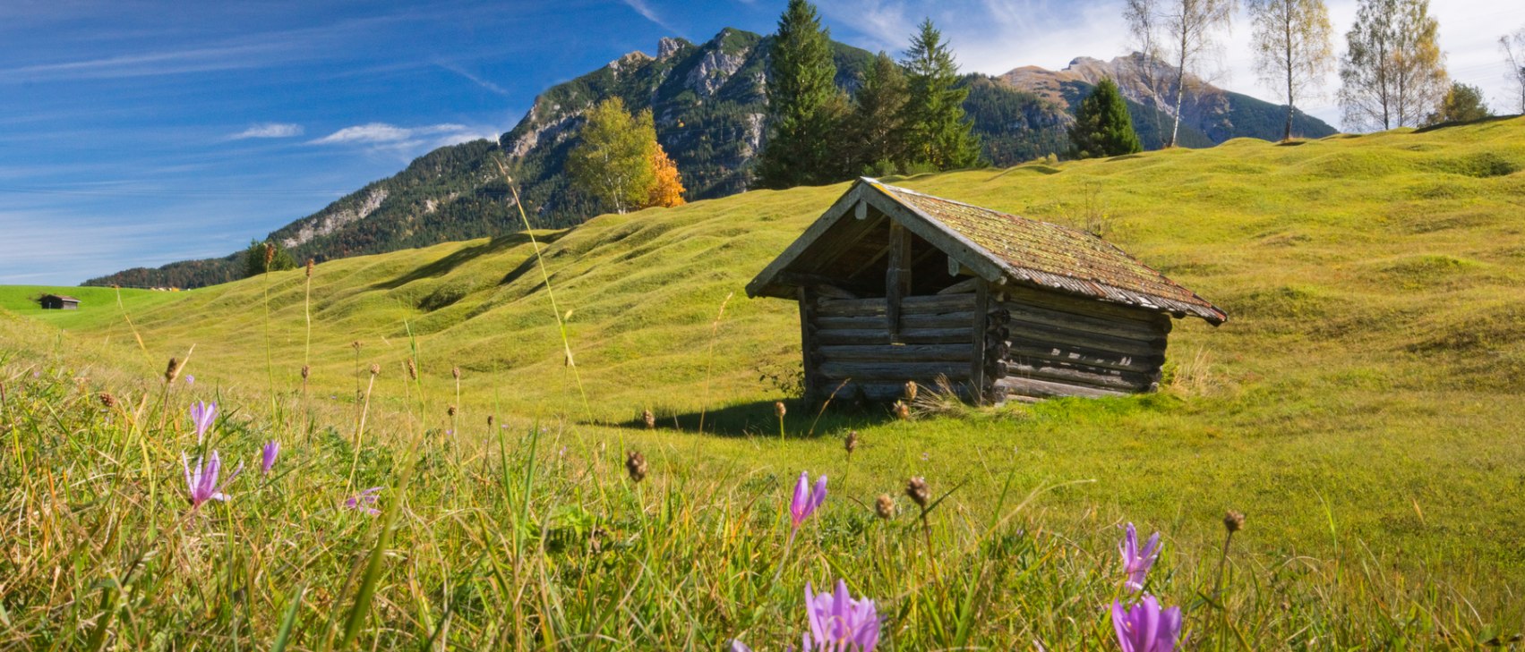 The starting point of this popular hike is the Hochstraße in Krün, accessible via the Bärnbichl bus stop (Hochstraße branch) or the hikers' car park on Krottenkopfstraße. The first tour destination is the Kapelle Maria Rast,amidst the well-known Buckelwiesen. The path is a little steeper in parts, but the fantastic view compensates for the effort. Continue towards the sun, past the Goas-Alm with a fantastic panorama of the Karwendel, Wetterstein and Zugspitzmassiv towards Mittenwald. Past the Schmalensee a narrow hiking trail leads to the Alpengasthof Gröblalm. From there it is not far to the historic centre of Mittenwald.