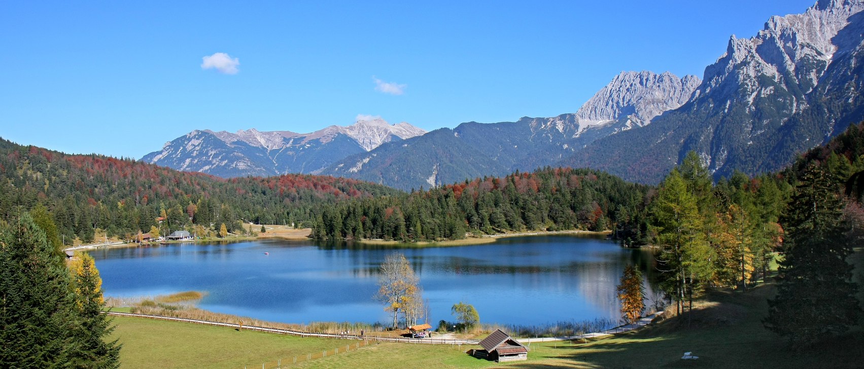 The informative and varied Wasserweg am Lautersee is one of a series of themed hiking trails in Alpenwelt Karwendel. This hiking trail, which is suitable for families (with prams), starts on the west shore of the lake and leads from there via the so-called "Reitweg" up to the nearby "Ferchenseehöhe" at about 1,100 metres. On the way, you can learn about the development of the Lautersee,as well as about the numerous peculiarities of this popular bathing lake above Mittenwald.