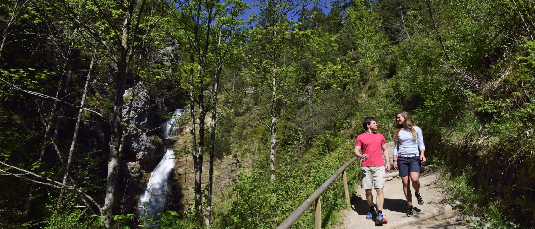 Directly in front of the station, you follow the avenue into the centre of the village. Here you also pass the pedestrian zone at Obermarkt and the Gries district. After the church, keep left in Gries and turn into Laintalstraß. At the end of the Laintalstraße keep to the right and you will soon reach the pleasant hiking trail that leads along the Lainbach into the valley of the same name. Now the ascent begins over serpentines, some of which are steep but nevertheless easy to negotiate. Hikers soon have an unforgettable view of the spectacular waterfall in the Laintal - a popular photo motif. In the upper part of the Gorge, a small bridge leads to the Grotto where a statue of the Virgin Mary can be seen. The upper end of the Laintalklamm gorge can be reached via a few serpentines. Afterwards, the hiking trail runs almost level again along the Lainbach to its source, the Lautersee at about 1,012 metres.
