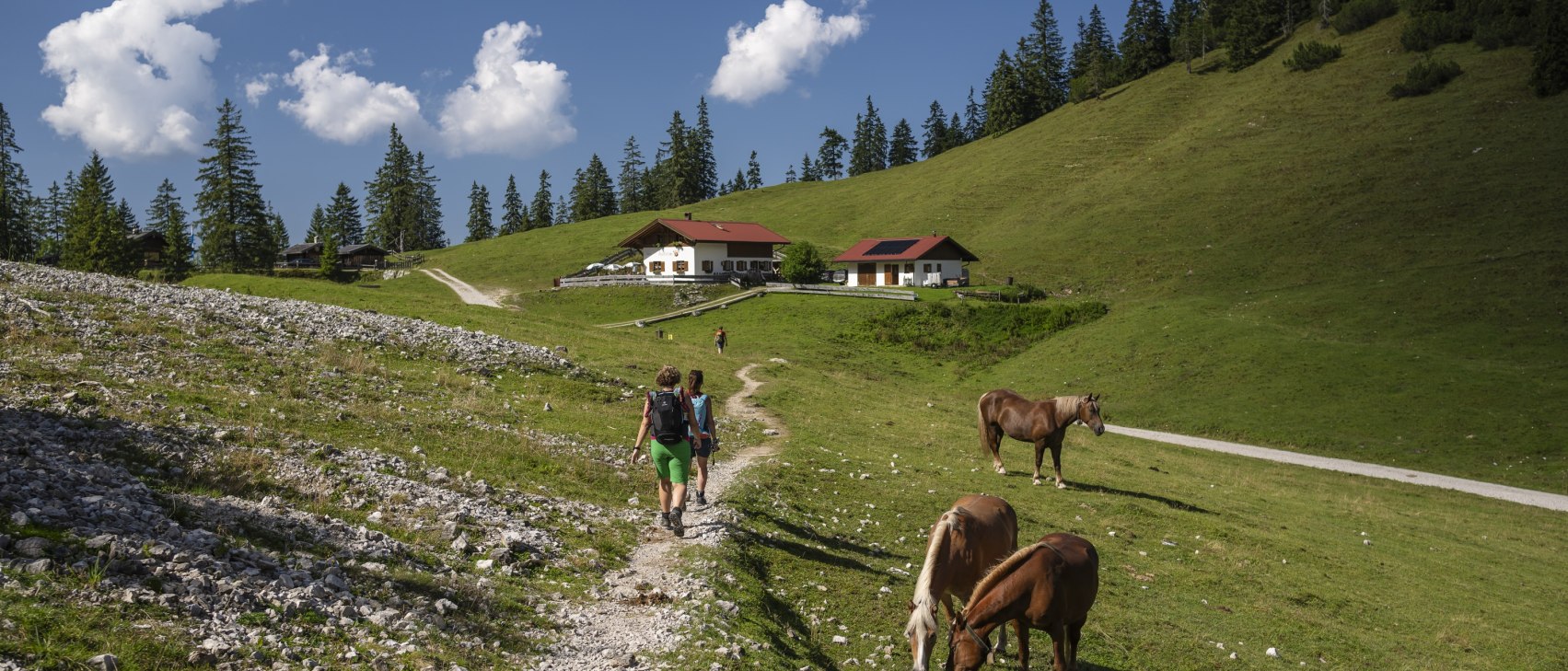 The starting point is the center of Krün, accessible by the bus stop "Ortsmitte Krün". At the Maypole, you take the Schöttlkarspitzstraße to the city hall, then continue down the mountain towards the Isar. From here, go over the Isar bridge, following the forest road to the left. After a short while you will reach a junction, where you will turn right, following the signs leading toward the Fischbachalm alpine hut. You will climb continually (sometimes steeply) until you reach the Fischbachalm alpine hut (operated July, August).
