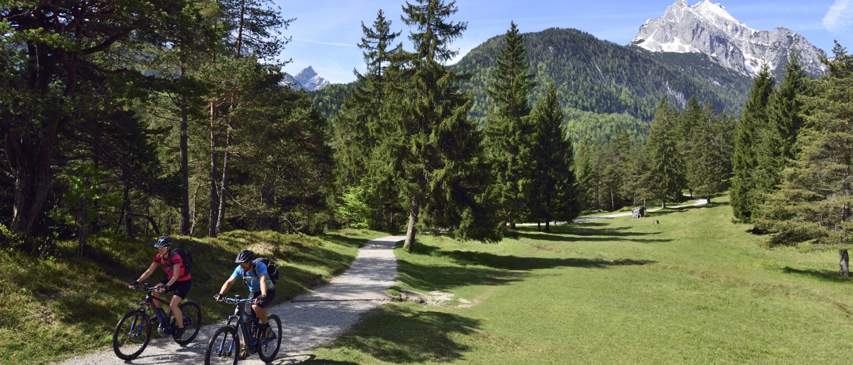 From the parking lot "Am Waudl" drive through the centre left onto Innsbruckerstraße and then turn right in the direction of Leutasch . In the left-hand bend, continue straight on toLautersee and Ferchensee. Follow the forest road to Elmau and there turn left onto the forest road to Kranzbach. Follow the road until shortly before Klais. After the toll booth, turn right and after the railway crossing, go through the Buckelwiesen meadows in the direction of Goas-Alm. Later, take a sharp left to the Youth Hostel. From here, walk the last 500 metres along the main road back to Mittenwald