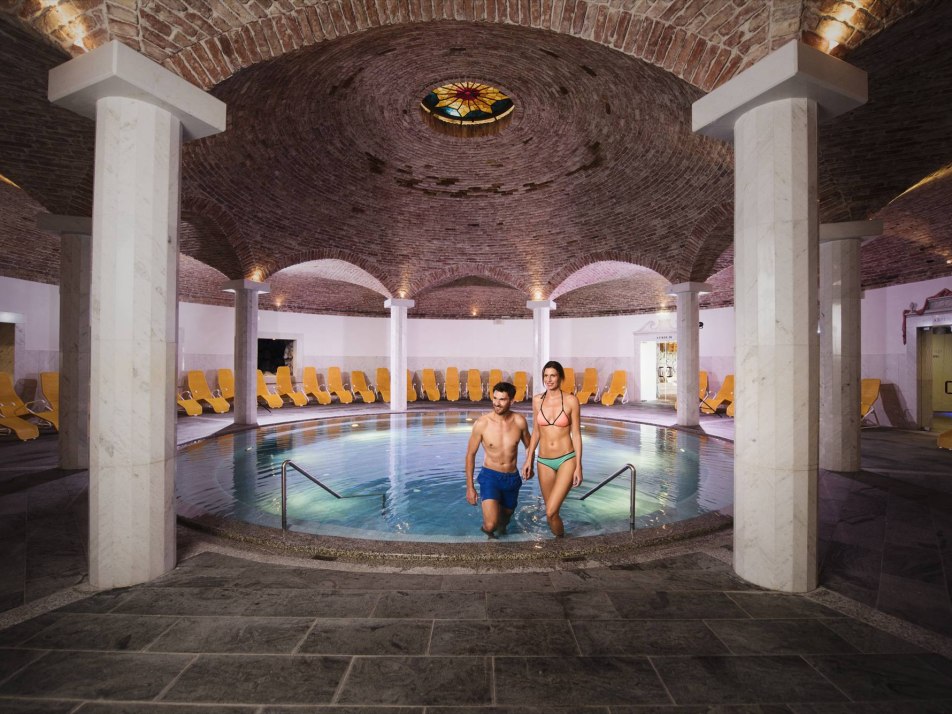 Adventure pool with a large indoor area, a separate children's area and an outdoor area nestled in a unique mountain setting with a view of the Seefeld Seekirchl.