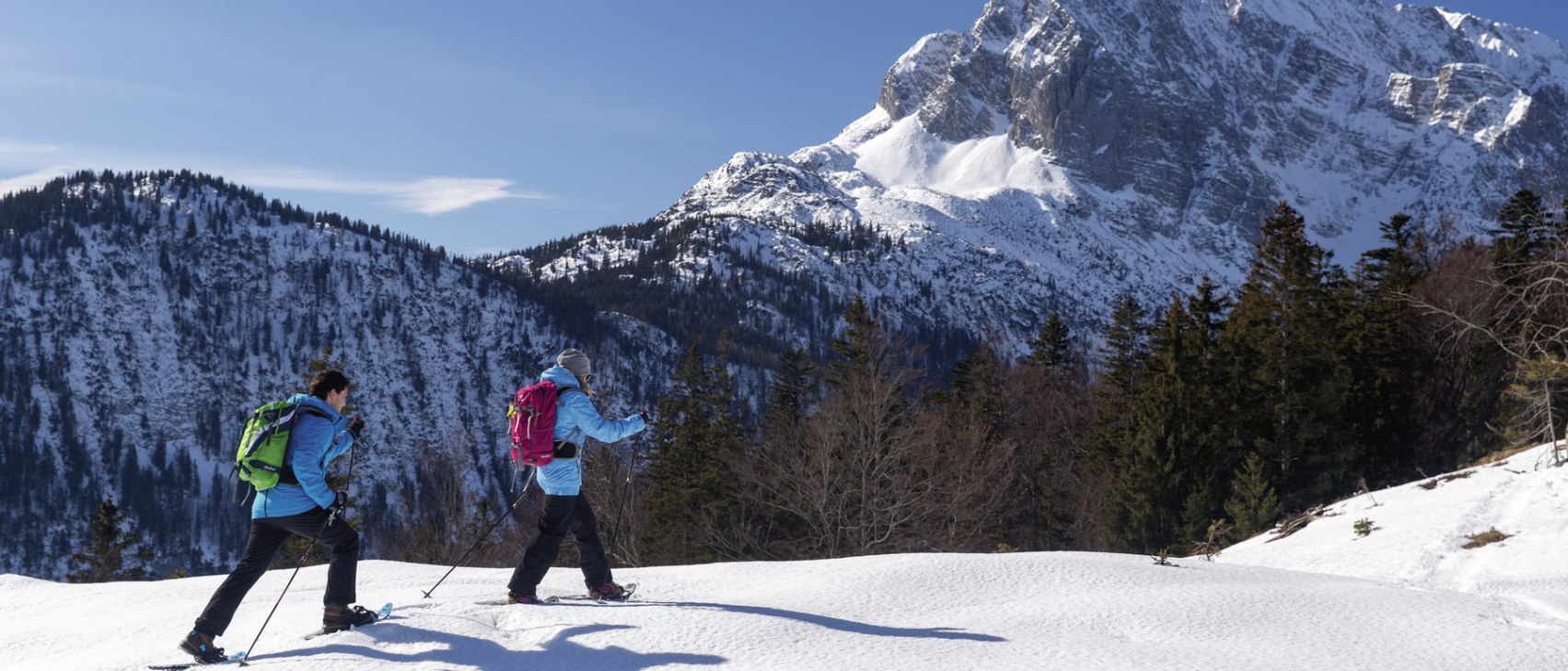 This varied snowshoe trek will take you from Kranzbach, near Krün, to Elmauer Alm (1,203 m) and then Eckbauer, above Garmisch-Partenkirchen. Experience a hike through the snow with unique views of the Karwendelgebirge mountains.