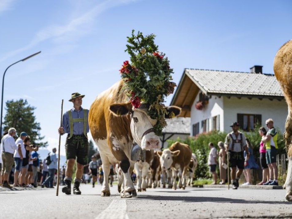 On Saturday, September 20, 2025, the famous cattle drive (Almabtrieb) with a festival in the village will take place in Krün. Krün's clubs and restaurants will provide local delicacies along the route and invite you to stroll and enjoy the market stalls from regional vendors. The cattle will be driven from the southern entrance of the village along Karwendelstraße and Schöttlkarspitzstraße. The cattle drive, with its village festival and farmers' market, will take place in any weather.