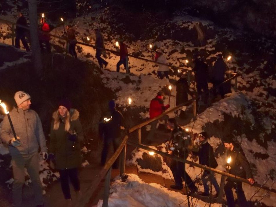 Join us for a romantic torchlight hike through the Laintal valley up to the valley station of the Kranzberg chairlift. With a cup of mulled wine we enjoy the view of the illuminated Mittenwald.